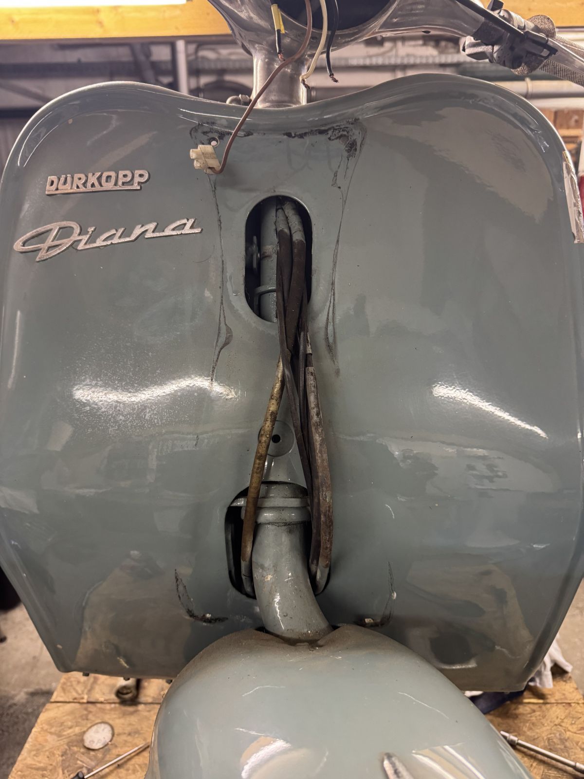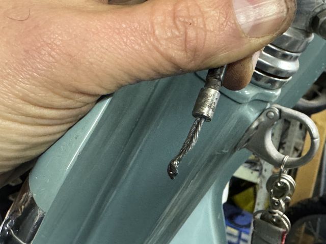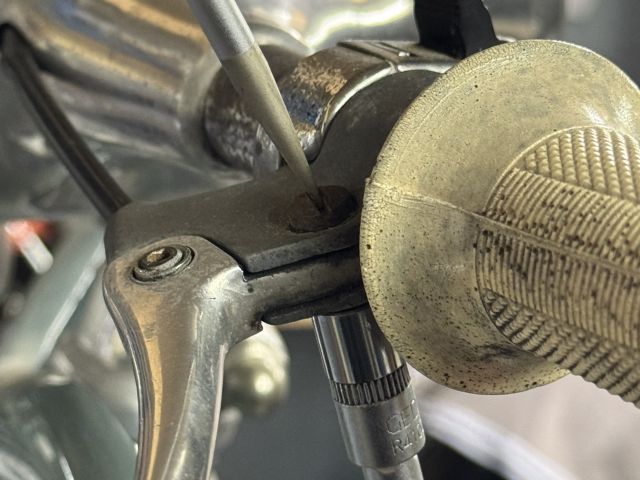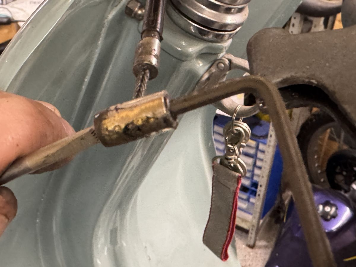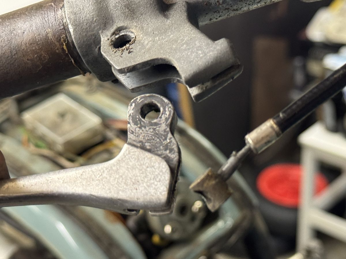 Als Erstes habe ich also die ‚Nase‘ am Beinschild entfernt, um an die Bowdenzüge zu gelangen. Der nächste Schritt war dann, die Züge an Vorderbremse, Kupplungshebel, Gasgriff und zuletzt am Chokehebel auszuhängen. Unterwegs gab es auch hier wieder einige Überraschungen und eine kleine Denksportaufgabe. Doch seht selbst