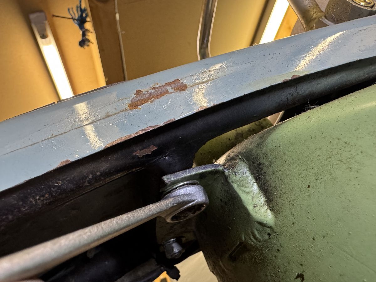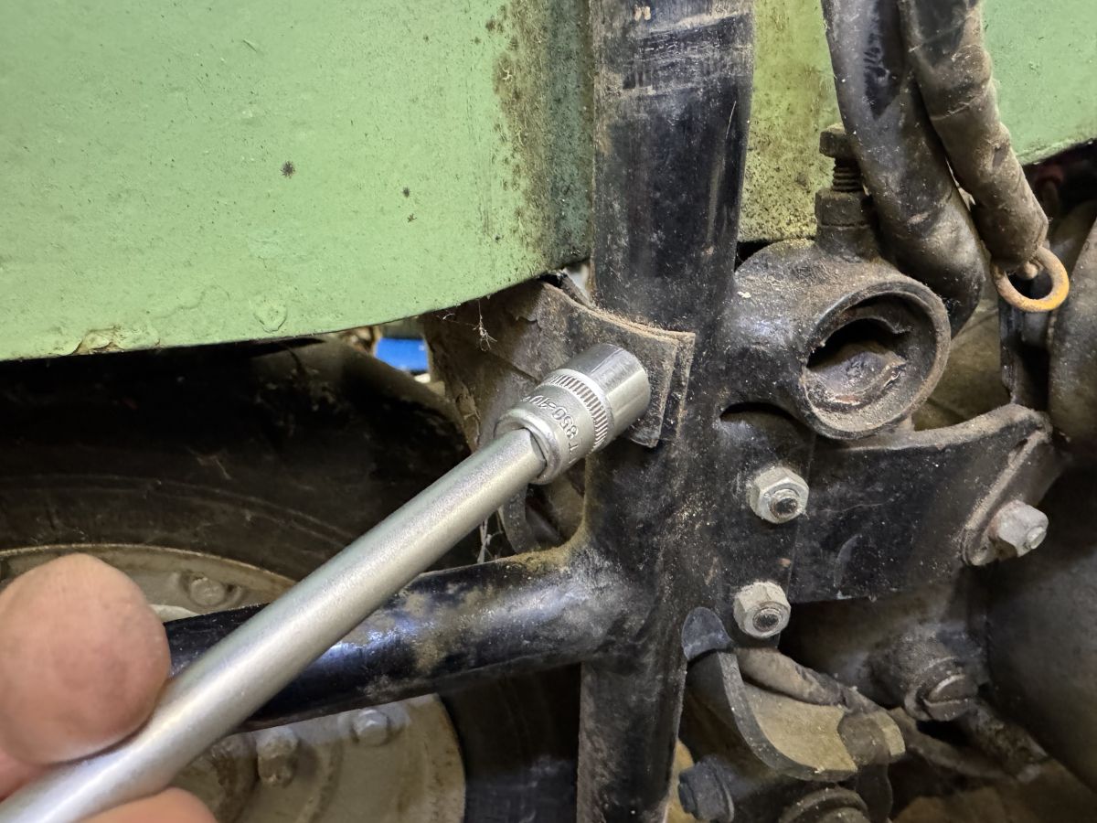 Weiter die zwei Muttern (M 17) am vorderen Bereich des Tanks lösen - am einfachsten auf der in Fahrtrichtung linken Seite mit einem Ringschlüssel. -