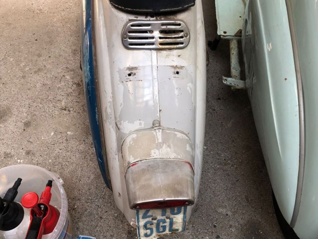 Auf einigen Rollertreffen habe ich die zunehmende Zahl an Vespa- und Lambrettarollern gesehen, die nicht wie bis dahin oft üblich komplett renoviert, sondern im Sinne des Wortes restauriert, also weitestmöglich in den ursprünglichen Zustand versetzt worden waren. Der Capri 50 S meiner Tochter hatte unter dem Decklack noch die originale Lacksubstanz – die, nach Tests an verschiedenen Stellen, wohl auch in ordentlichem Zustand war. So war der Lack ohne Anschliff überlackiert worden, was die Aufbereitung sehr vereinfachte. Leider war der "neue" Lack auch ein 2K-Lack, der nur mit einer gehörigen Menge Aceton bei entsprechender Einwirkzeit vom Untergrund abging. Bei den Backen und dem Lenkkopf war aber selbst das nicht möglich; hier half nur der Weg über vorsichtiges Abschleifen.