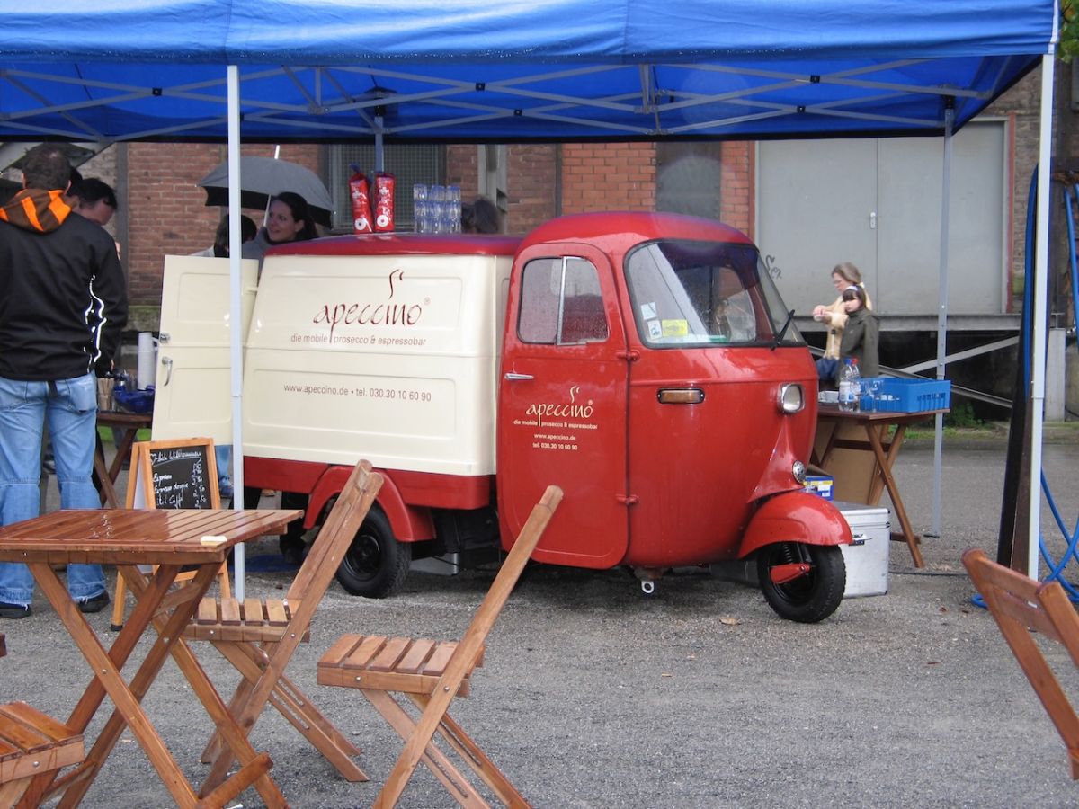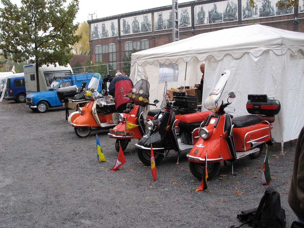 Auf einem recht großen Außenareal zeigten zahlreiche Markenclubs ihre zwei und vierräderigen Fahrzeuge. Überwiegend waren deutsche Marken vertreten, für die auch Teilehändler unter Planen und Zelten ihr Ersatzteilsortiment und Zeitgenössisches anboten. Die Roller- und Zweiradfraktion war überraschend gut mit Vespa, NSU-Lambretta, Heinkel, Kreidler & Co. vertreten.
