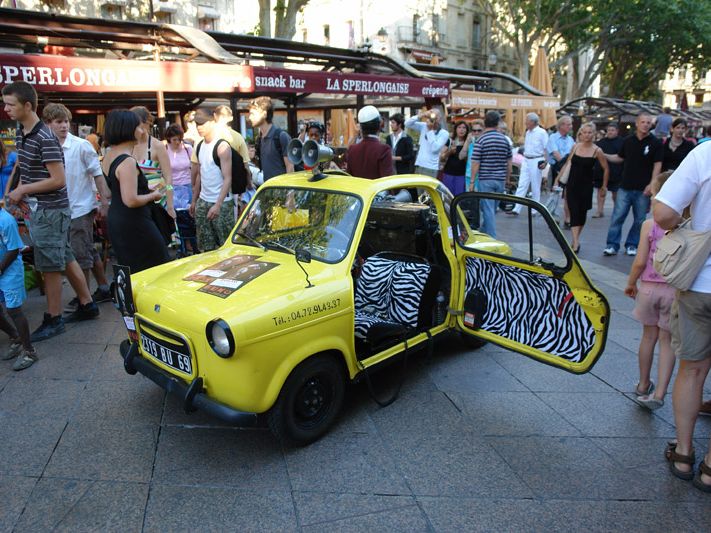 Das ein Vespa 400 auch heute noch ein aufsehenerregendes Gefährt ist, zeigen die nachfolgenden Fotos, die Regina und Michael aus Avignon mitgebracht haben. Auf dem dort im Sommer stattgefundenen Theaterfestival zogen verschiedene Künstlergruppen tagsüber durch die Stadt, um für ihre am Abend stattfindenden Veranstaltungen zu werben.