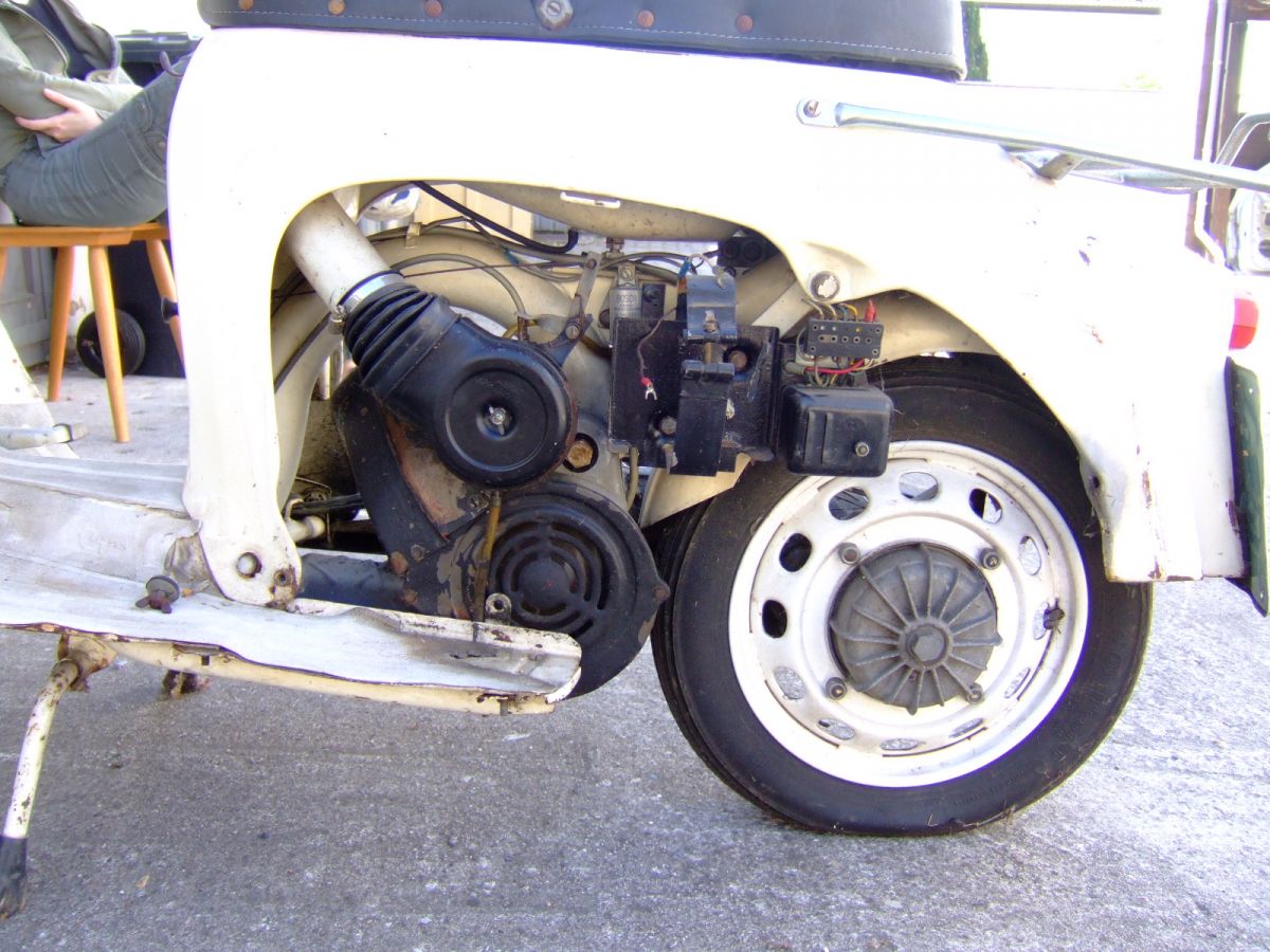 Das Motorgehäuse ist komplett aus Alu gegossen, die Kette läuft verschleißarm in einem großzügig bemessenen Getriebe-Ölbad. Der Direktsaugende Zylinder wird über einen DellOrto ME18 BS Vergaser mit Gemisch versorgt, eine Dansi-Zündung sorgt für eine 6-Volt Spannungsversorgung an Board des Rollers.