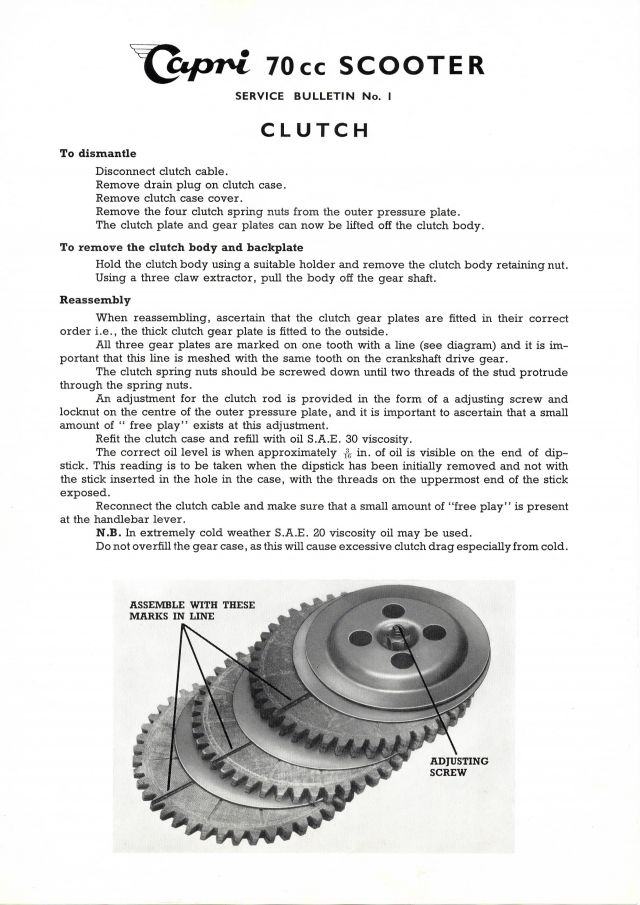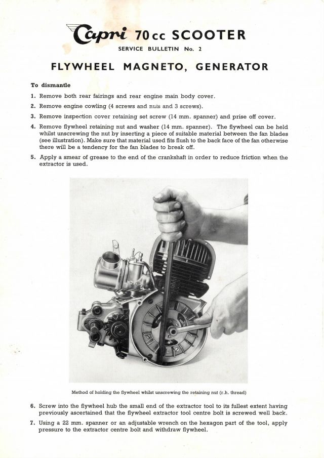 Die Capri Scooters LTD gab wie ich vermute kurz nach Markteintritt des Capri 70 Roller eine 4-seitige Service Mitteilung an die Werkstätten heraus. Die Themen waren "Kupplung De- und Remontage", "Lüfterrad / Lichtmaschine" und "Tankverschluss" sowie "Wellenführung für den Tachometerantrieb". Die Anleitungen sind mit einigen Bildern versehen. Service Bulletin No. 2 erklärt zumindest ganz gut warum viele Lüfterräder beschädigt sind - die gezeigte Fixierungstechnik des Monteurs an den Lüfterradschaufeln ist alles andere als gut geeignet eine festsitzende Wellenmutter zu lösen - die Chance ist recht groß das erst die Lüfterradschaufeln abbrechen bevor sich die Mutter bewegt.