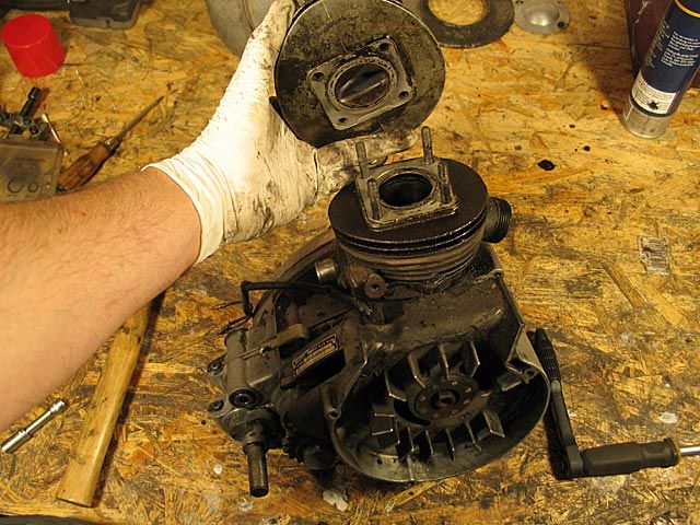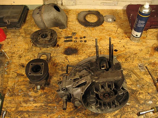 Man montiert zunächst das Lüftergehäuse, die Kerze, den Vergaser und die Startvorrichtung samt der dazugehörigen, am hinteren Ende des Gehäuseblocks sitzenden Starrachse ab. Hierzu bedarf es weder eigenen Werkzeugs noch besonderer Maßnahmen. Dann schreitet man zum Ausbau des Motors, indem man wie folgt vorgeht: