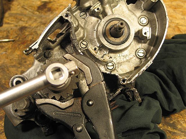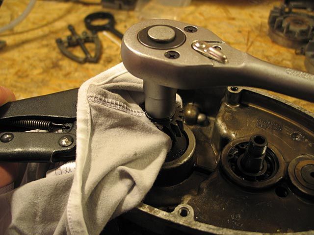 Wieder kann das Spezialwerkzeug durch eine Gripzange ersetzt werden. Um ein Abrutschen zu verhindern, habe ich ein dickes Tuch zwischen Zahnrad und Zange gelegt.
