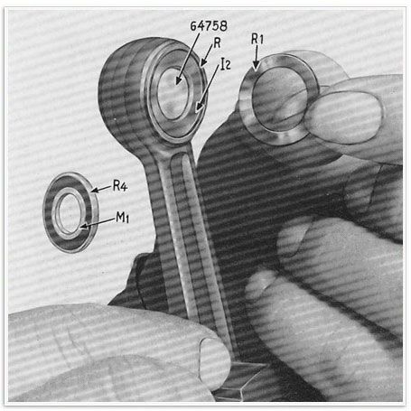9 ) Abb 16 – Man bestreicht die Bohrung des Pleustangenkopfes und die Röllchen mit Fett (Lagerfett), montiert die Röllchen im genannten Kopf und setze den Keil 64758 ein.