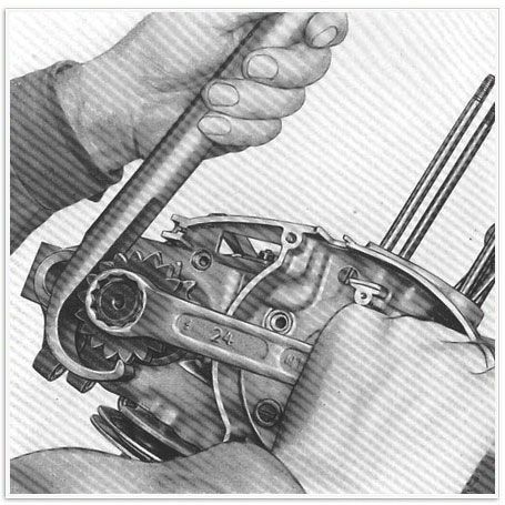 17) Abb. 12 – Man lege die Hauptwelle so auf einen Schraubstock auf, dass die Schaltmuffe zwischen die Backen zu stehen kommt. Dann löse man mittels eines Sticheisens mit 3 mm Durchmesser den Stift und löse so die Schaltmuffe, sie Schaltstange und bei den Motoren 354 RZKY und 374cRKY, die beiden Kugeln mit der dazugehörigen Rückholfeder.