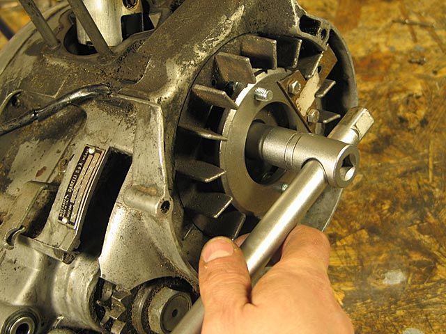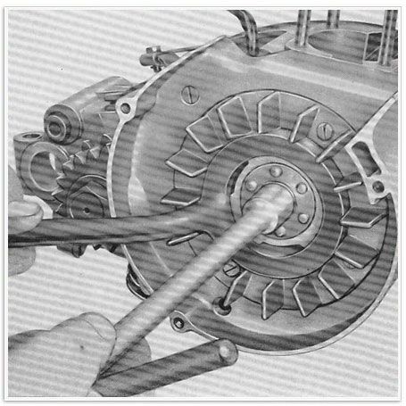 5 ) Abb. 1 - Mit Hilfe des Werkzeugs 64751 den Schwungmagnetzünder festhaltend, schraubt man mittels eines 14- mm-Schlüssels die Haltemutter von diesem los und streift den dazugehörigen Federring ab.