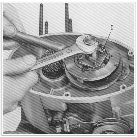 8) Abb. 4 – Mit Hilfe des Werkzeugs 64753 und eines 24 mm-Polygonalschlüssels nehme man die Mutter von der Hauptwelle des Getriebes und entferne die am Ende dieser Welle befindlichen Stahlkugeln.