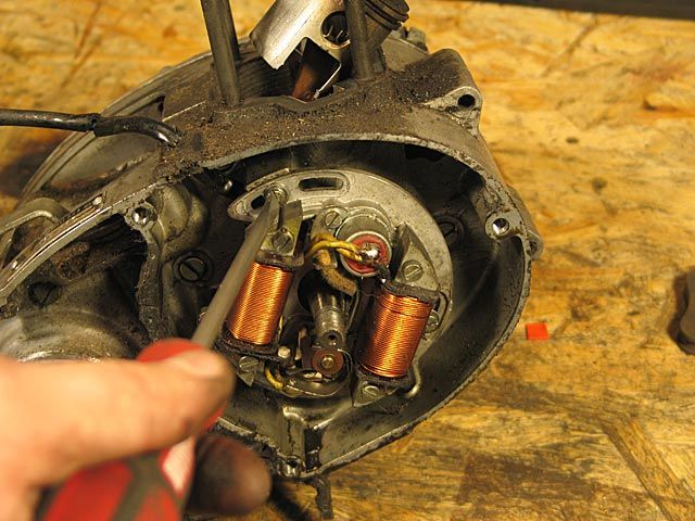 4) Man nimmt den Schutzdeckel vom Schwungmagnetzünder ab, indem man die beiden Schrauben entfernt, die ihn an letzterem festhalten.