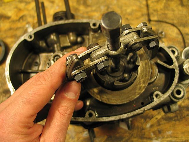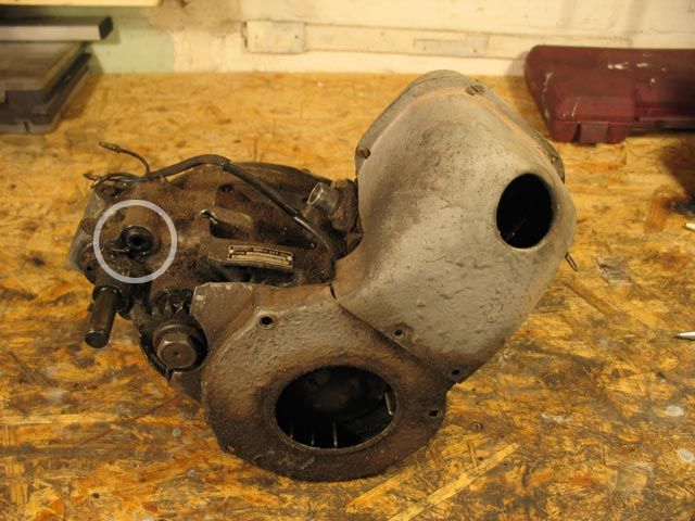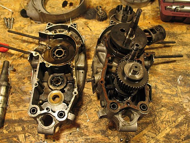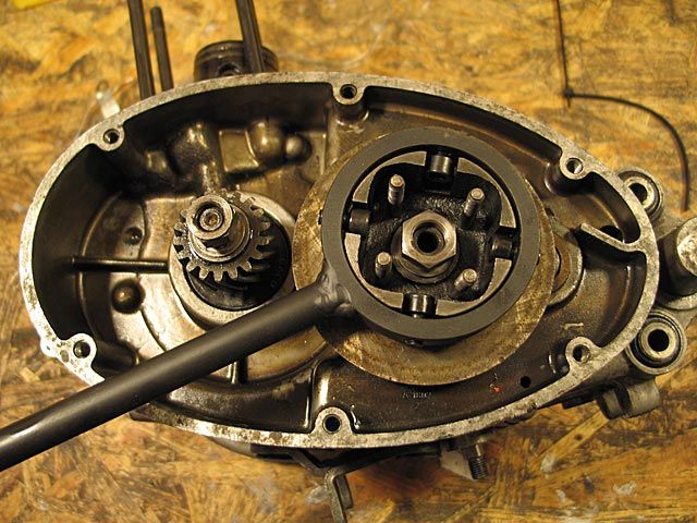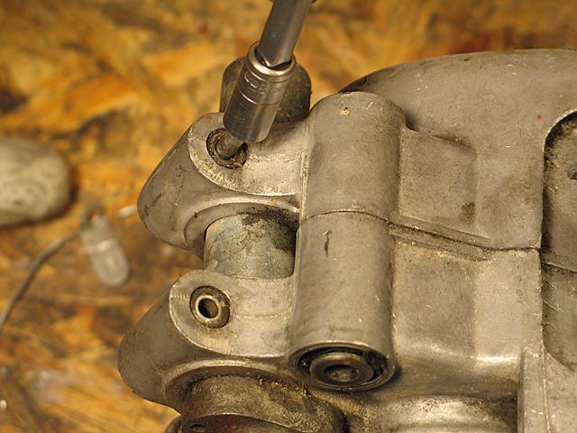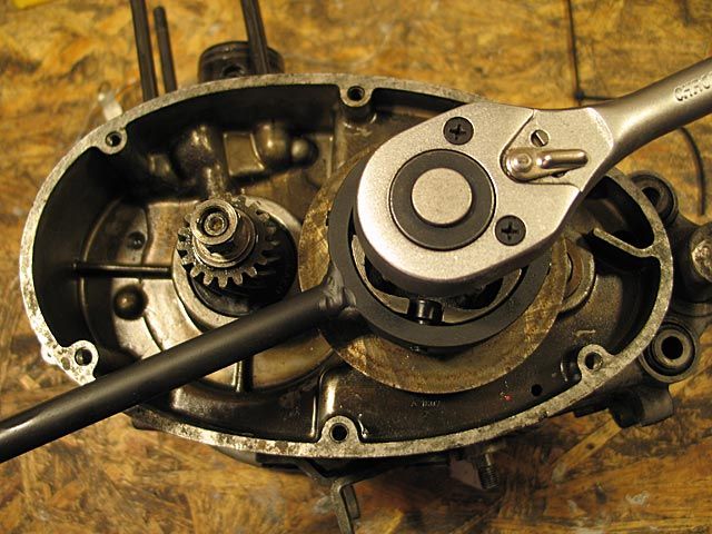 9) Man lasse das Öl aus dem Getriebe und aus der Kupplung ab, indem man den unterseitgen Verschluss vom linken Deckel abnimmt. Man nehme den linken Deckel und die dazugehörige Dichtung durch lösen der 6 Schrauben ab, welche ihn am Motorgehäuse festhalten.