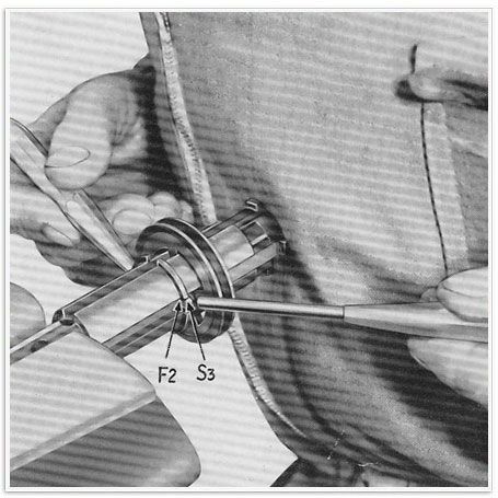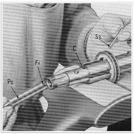 3 bis ) Man verschiebt die Schaltmuffe, bis die Bohrung (4 mm Durchmesser) auf dem Grund des Schaltmuffenschlitzes mit den Schlitzen C – C2 und der Bohrung F4 übereinstimmt.