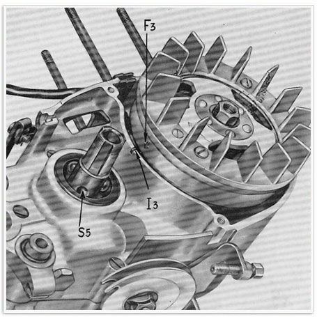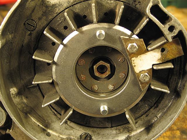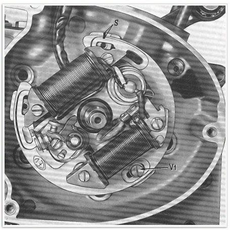 Sollten die Kontakte vor oder nach der besagten Stelle öffnen, so muss der Schwungradmagnetzünder abgenommen, die Halteschrauben der Ankerplatte leicht gelöst und letztere in die erforderliche Richtung gedreht werden; dann die drei Schrauben wieder leicht anziehen, den Schwungmagneten wieder montieren und die Kontaktöffnung neu prüfen.