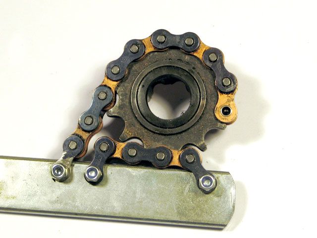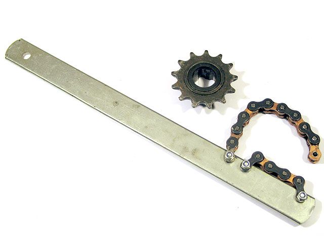Das benötige Spezialwerkzeug läßt sich mit einfachsten Mitteln selbst herstellen. Man benötigt dazu lediglich ein Stück Flachstahl aus der Restekiste oder dem Baumarkt und ein paar übrig gebliebene Kettenglieder (Kettenmaß 1/2 x 3/16 Zoll).