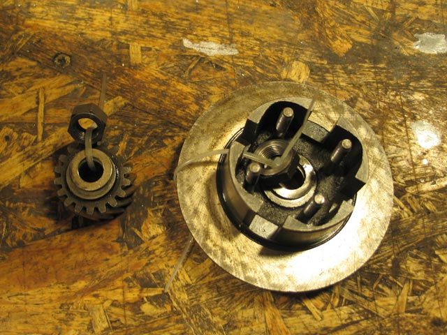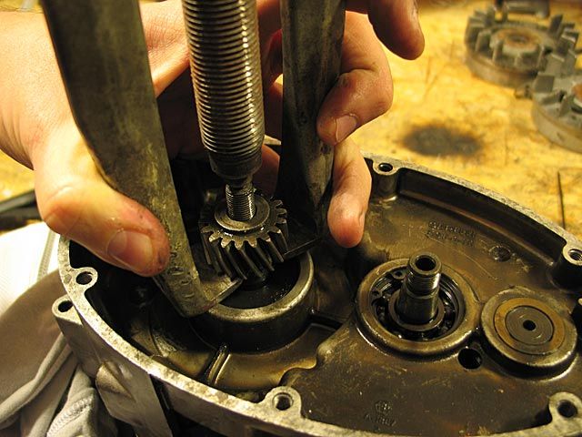 Sieht etwas überdimensioniert aus, aber die Primär ist meist verdammt fest auf dem Konus der Antriebswelle aufgesetzt. Bei meinem Garelli 50 S Motor war das Primärzahnrad sogar ohne den Halbmond montiert, da es hierfür keine Aussparung im Zahnrad gab: