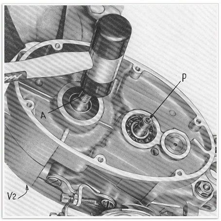 15) Abb. 10 – Vom der rechten Gehäusehälfte entfernt man die 9 (!!!) Schrauben V2, welche die beiden Hälften miteinander verbinden. Dann schlage man mit dem Schlegel so lange wechselweise auf das Ende der Kurbelwelle A und der Vorlegewelle P, bis die beiden Gehäusehälften voneinander getrennt sind.