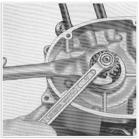 21 ) Man schiebe das Ritzel über das Ende der Kurbelwelle, dazu noch den Federing. Dann ziehe man die Mutter mittels des Werkzeugs 64756 und des 14 mm Polygonalschlüssels (Ringschlüssel), die schon bei der Demontage Verwendung fanden, fest an. (Abb. 8)