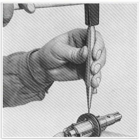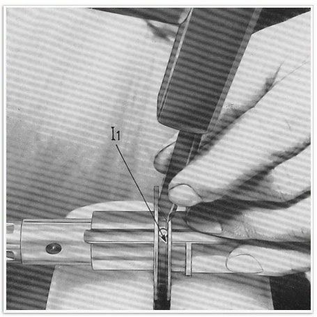5 ) Abb. 14 – Mit Hilfe eines Stemmeisens werden auf dem Grunde der Schaltmuffe zwei Kerben I1 angebracht, um ein herausgleiten des Stiftes zu vermeiden. Wichtig ist, das die Kerben derartig sind, dass sie auch wirklich den besagten Zweck erfüllen.