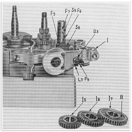 16 bis ) Beim Motor 353ERKY (Abb 17 bis) müssen die Kugeln S9 eingefettet werden. Dann führt man 2 davon in die entsprechende Bohrung F5 ein und schiebt das Zahnrad 15 auf die Hauptwelle. Diese Maßnahme erfolgt für die Bohrungen F6 (2 Kugeln) und F7 3 Kugeln). Es werden dabei nacheinander die entsprechenden Zahnräder 16 und 17 aufgesetzt, wobei bei letzteren darauf zu achten ist, das der rote Punkt B nach oben gerichtet ist.