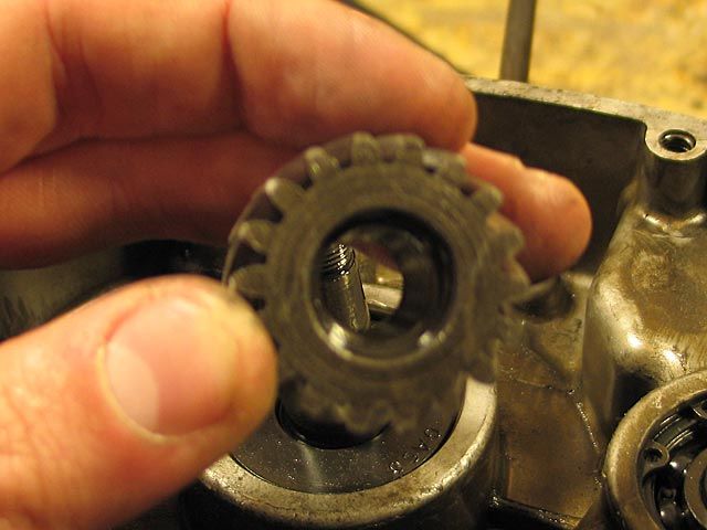 19 ) Man baut die Kugeln zu ¼ S5, nachdem man sie eingefettet hat, in die entsprechenden Sitze ein, schiebt das Ritzel auf die Hauptwelle und setzt die Gummidichtung in das Ritzel ein.
