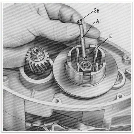 22 ) Man führe die Kupplungsdruckstange A1 in die Bohrung der Vorlgewelle ein, wobei darauf zu achten ist, dass das ausgebaute Ende E nach unten gerichtet ist. Dann setze man die Kugel S6 zu 7/32 ein.