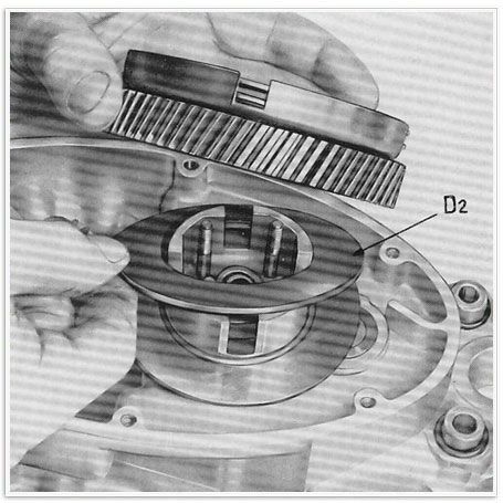 Man schiebe die Belagscheibe D2 auf den Kupplungskörper, ferner das Zahnrad mit samt Kupplungslamellen, die Drucklamelle mit samt der Zentralstellschraube und der dazugehörigen Gegenmutter.