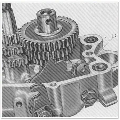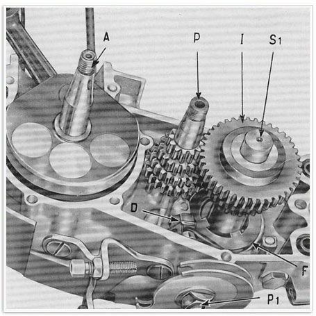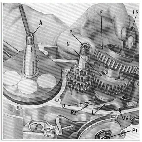 Abb 11 bis – Demontage des Getriebes. Beim Motor 353 ERKY muss man, bevor man zur Entfernung der Schaltwelle P1 und der Schaltgabel F schreitet, den Hebel L2, welcher der Einstellung (Einrastung wäre hier treffender; der Schreiberling) der Gangposition dient, mittels Draht oder Schnur am rechten Gehäuse festmachen. (Abb. 11 bis)