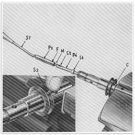 2 bis) Man führe die Schaltstange P4 ganz ein. Dabei ist darauf zu achten, dass der Schlitz C2 mit dem Schlitz C übereinstimmt. Sodann wird auch die Schaltfelderhalterungsstange P5 eingeschoben, in die man vorher noch die Feder M eingesetzt hat. Endlich schiebt man mittels des Stiftes S7 (Durchmesser 10 mm) nach, bis die Bohrung F4 mit den Schlitzen C und C2 übereinstimmen.