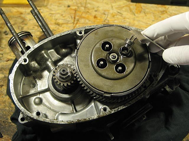 Um zu prüfen, ob die Kupplungsfedern gleichmäßig fest angezogen sind, betätigt man den Kupplungsausdrückhebel. Dabei soll sich der Kupplungsteller gleichmäßig axial auf der Vorlegewelle verschieben.