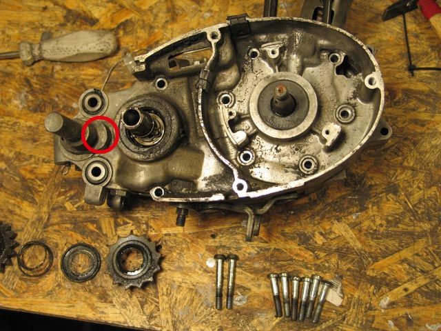 ACHTUNG: es gibt 9 Gehäuseschrauben, die entfernt werden müssen. Wie im Bild zu sehen, ist die Steckachse noch nicht entfernt. An der Stelle des roten Kreises versteckt sich die 9te Schraube. Vor dem Trennen der Motorhälften muß die Achse unbedingt entfernt und die Schraube raus, sonnst droht bei zuviel Gewalt ein brechen des Gehäuses!!!