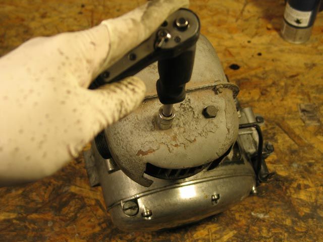 Der Vergaser kann direkt am Zylinder gelöst und abgezogen werden. Danach löst man sämtliche Kabel und Seilzüge, die den Motor noch mit dem Rahmen noch verbinden. Als nächstes wird die Kronenmutter des Auspuffs gelöst und der Auspuffkrümmer abgezogen. Weiterhin sollte die vorderen und hinteren Kettenkastenbleche demontiert werden, damit die Kette später besser vom Motor gelöst werden kann.