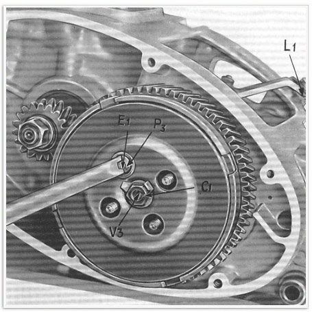 Die in Frage stehende Kontrolle wird durchgeführt, indem man den Schwungradmagnetzünder langsam im Uhrzeigersinn dreht, bis der auf dem Zünder ersichtliche Pfeil F3 mit der Kerbe 13 auf dem rechten Halbgehäuse übereinstimmt. In dieser Stellung müssen die Kontakt die Öffnung beginnen.