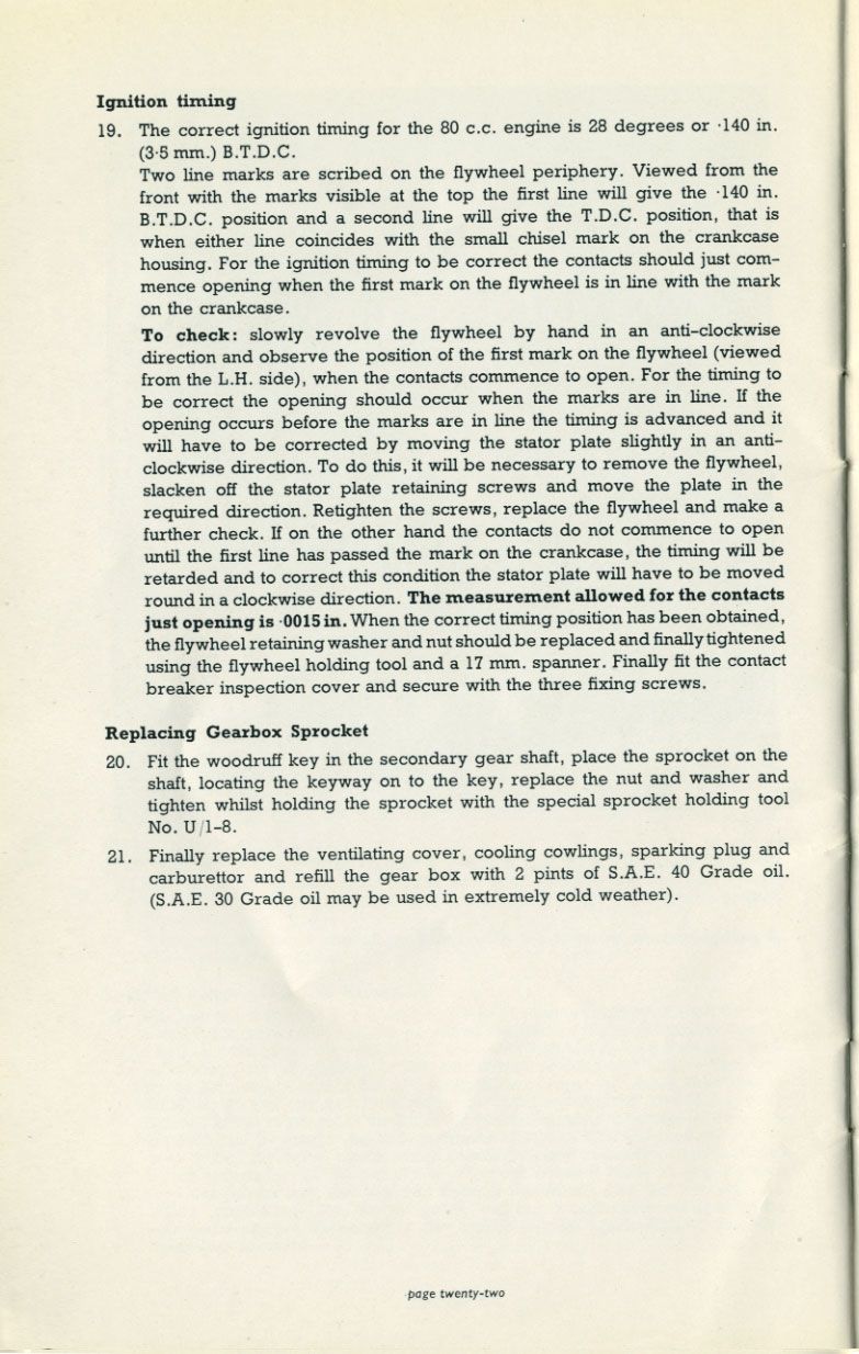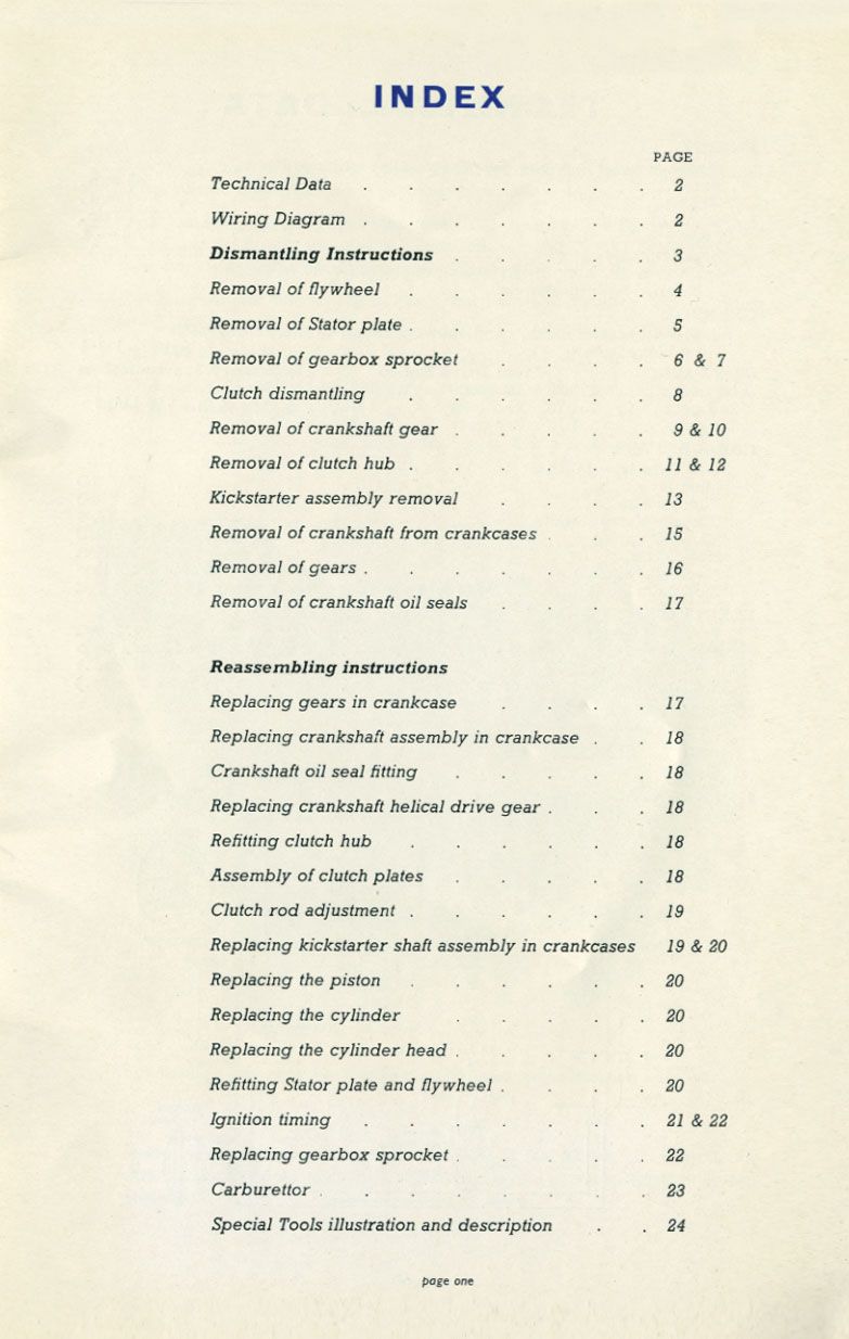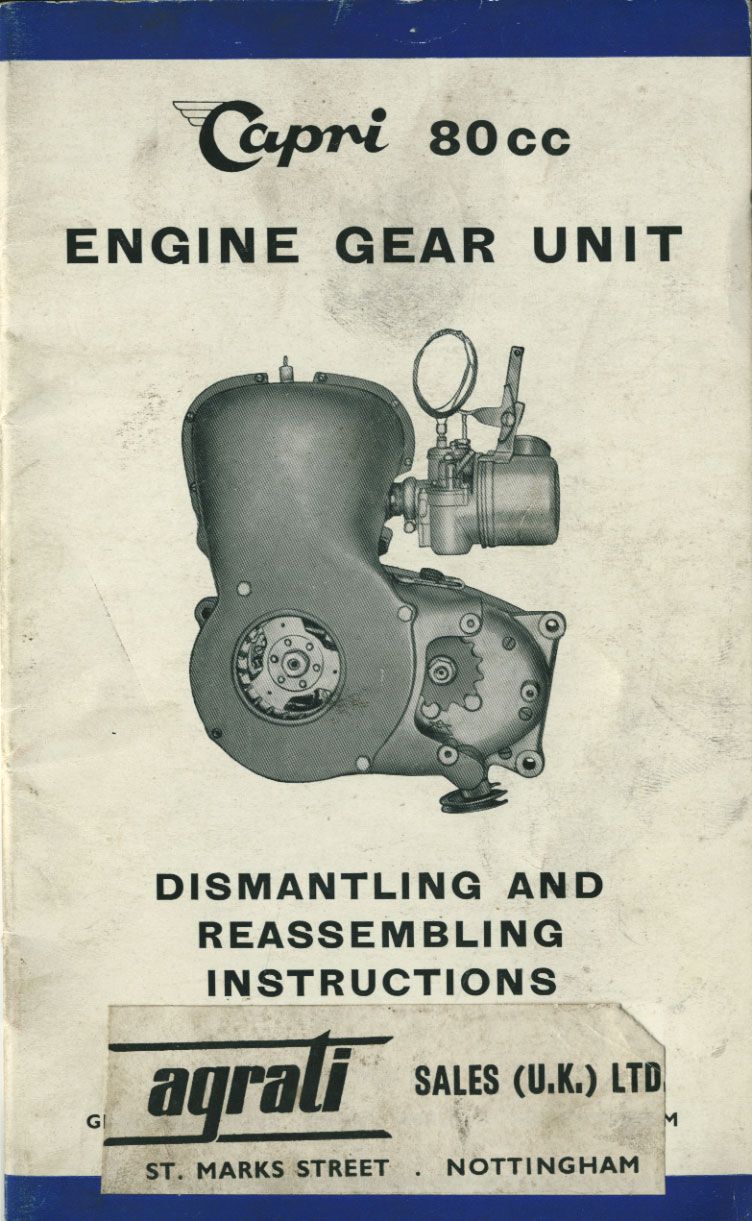 Werkstatthandbuch für die mit Minarelli 80 ccm ausgestatteten Modelle des Capri Rollers. Auf 24 Seiten wird die De- und Remontage detailliert und mit allen benötigten Spezialwerkzeugen in englischer Sprache beschrieben.