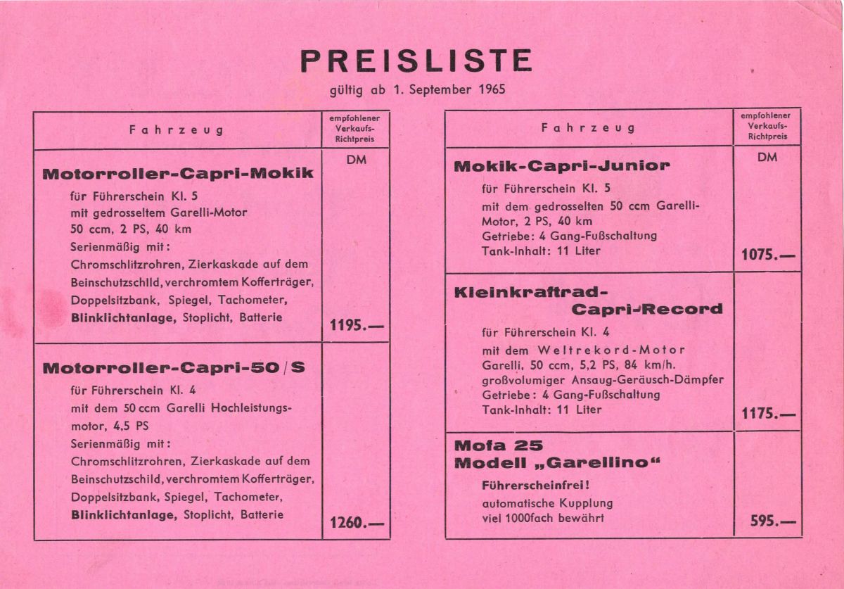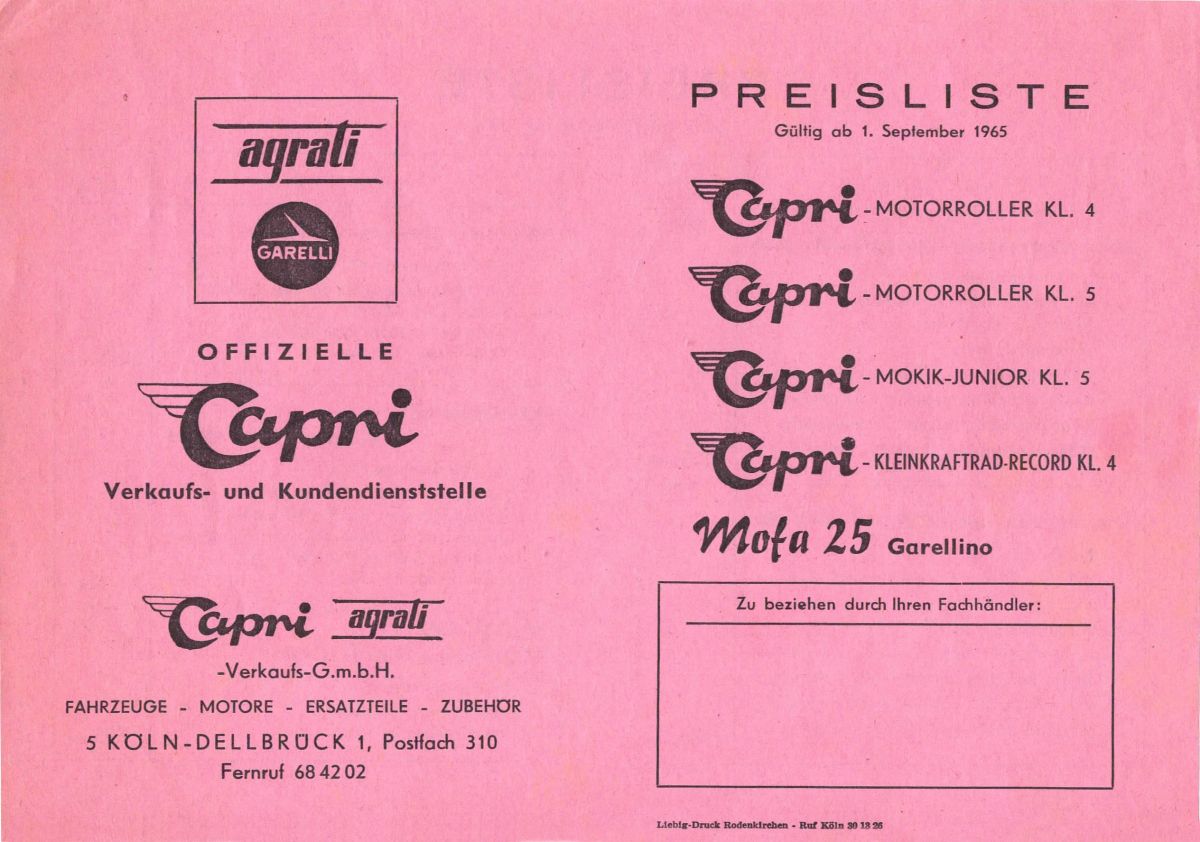 Diese Preisliste würde im September 1965 von der Firma Capri Agrati Verkaufs GmbH, Klön für die Capri 50 Modelle "Mokik" (1.195 DM) und "50 S" (1.260 DM) sowie für die Zweiradmodelle "Mokik Capri Junior" (1.075 DM), das "Kleinkraftrad Capri-Record" (1.175 DM) und das Mofa "Garellino" (595 DM) herausgegeben.