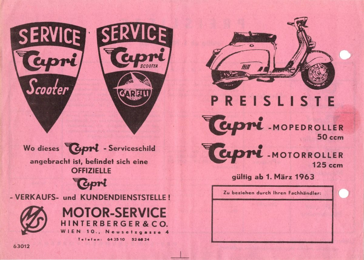 Auch Österreich war ein bedeutender Markt für den Absatz der Capri Roller. Die der Alpenrepublik war die Firma Hinterberger der Generalimporteuer und brachte dieses schön gestaltete Faltprospekt heraus. Lieferbar waren sowohl Motoren mit 3 wie auch 4-Gang-Motor von Garelli die mit Pedalen statt mit einem Kickstarter gestartet wurden. Anhand der Druckauflagenummer auf der Rückseite unten links würde ich das Prospekt auf 1963 schätzen.